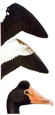In flight, the male has a broad white wing stripe near the wing tips, a white neck, throat and body and the female has a narrow white rear margin on the innerwing.