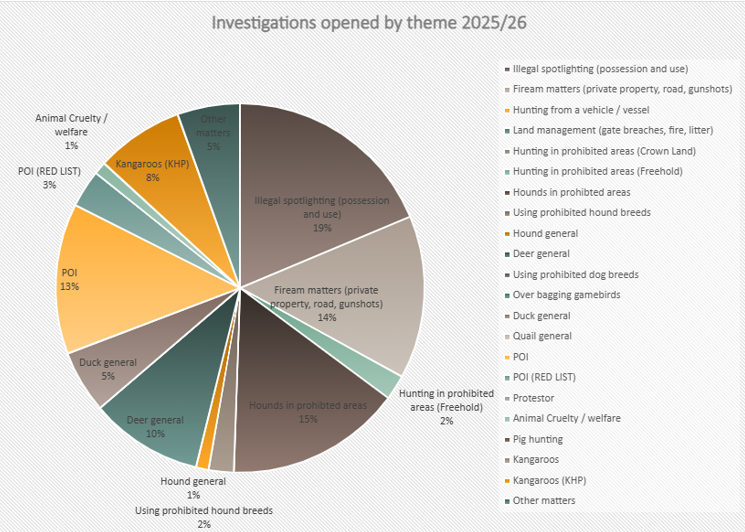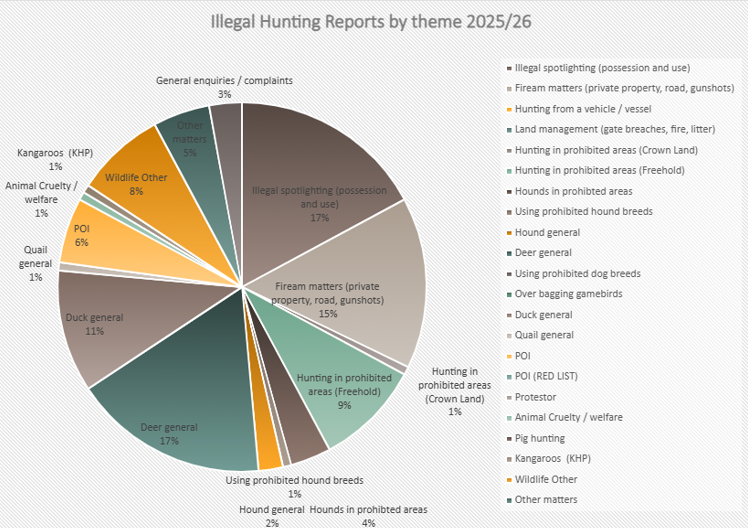From 1 July 2025 to 31 March 2026, the GMA received 140 illegal hunting reports from members of the community. The top three themes of these reports related to spotlighting and deer hunting (17% for both), firearm matters (15%) and duck hunting (11%).