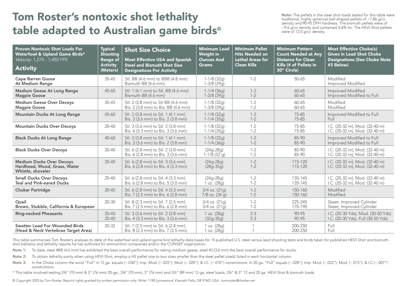 Tom Roster’s Nontoxic Shot Lethality Table Adapted to Australian Game Birds summarises Tom Roster’s analyses at the time of publication of the waterfowl and upland game bird lethality data bases for 15 published U.S. steel versus lead shooting tests. It also includes birds taken for published HEVI-Shot and bismuth shot ballistics, and lethality reports he has authored for ammunition companies and/or the CONSEP organisation.